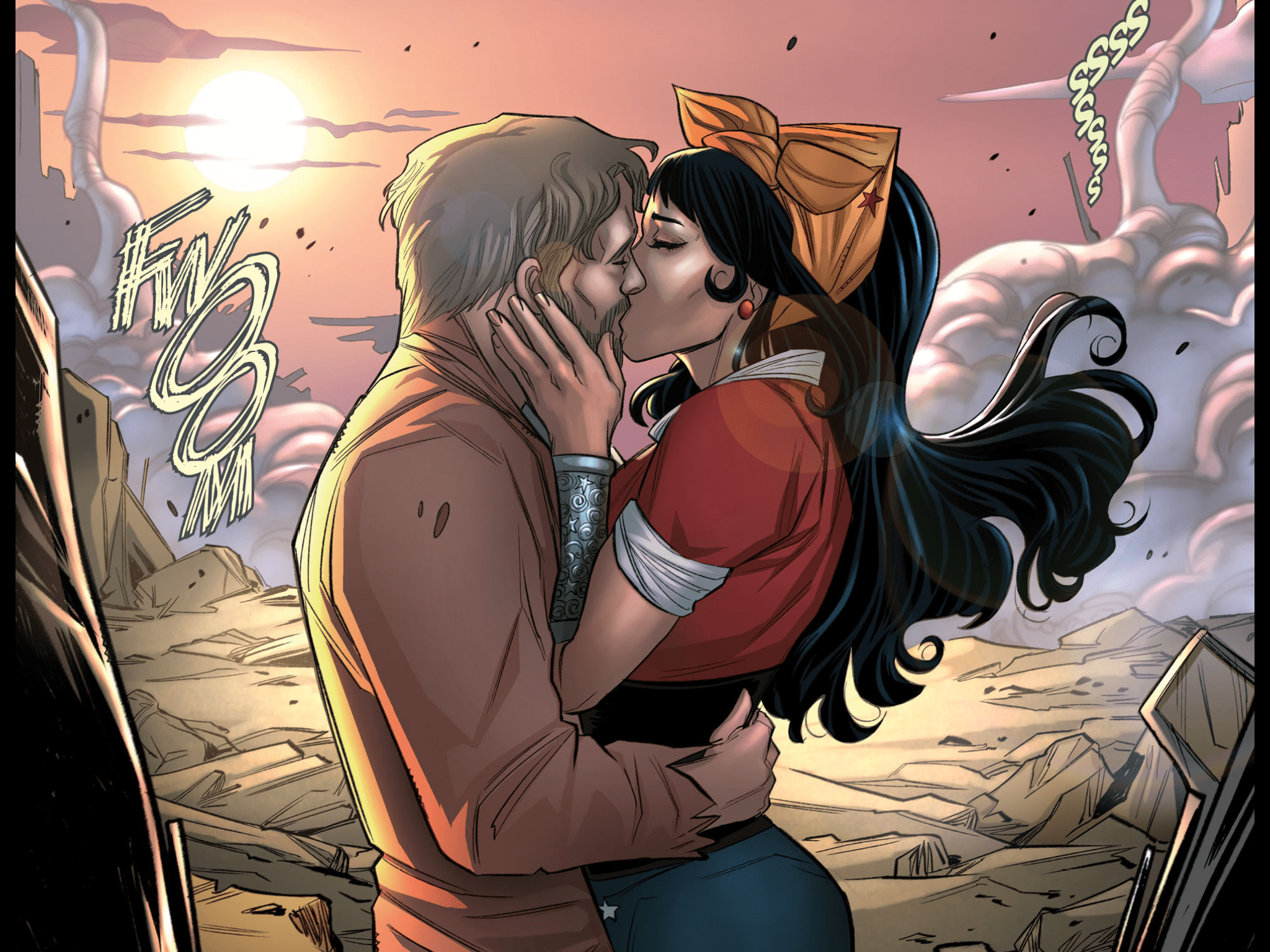 With Big Barda kissing and snuggling with girls elsewhere in London, it’s up to Mera to remind Steve that she was Diana’s very first kiss.