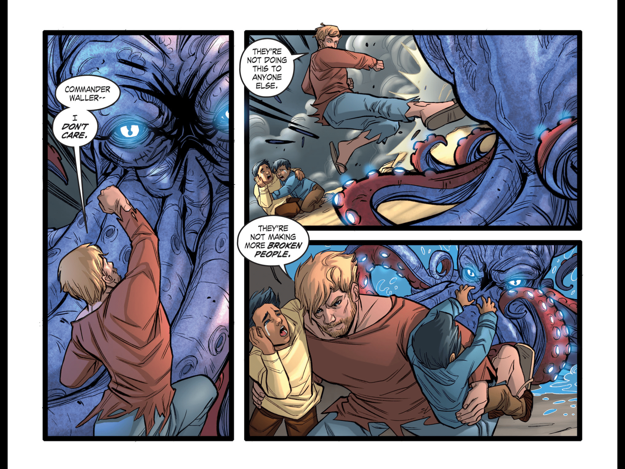 After fighting the Luftwaffe on their death horse, Wonder Woman and Steve return to Earth, where they beat up an octopus.