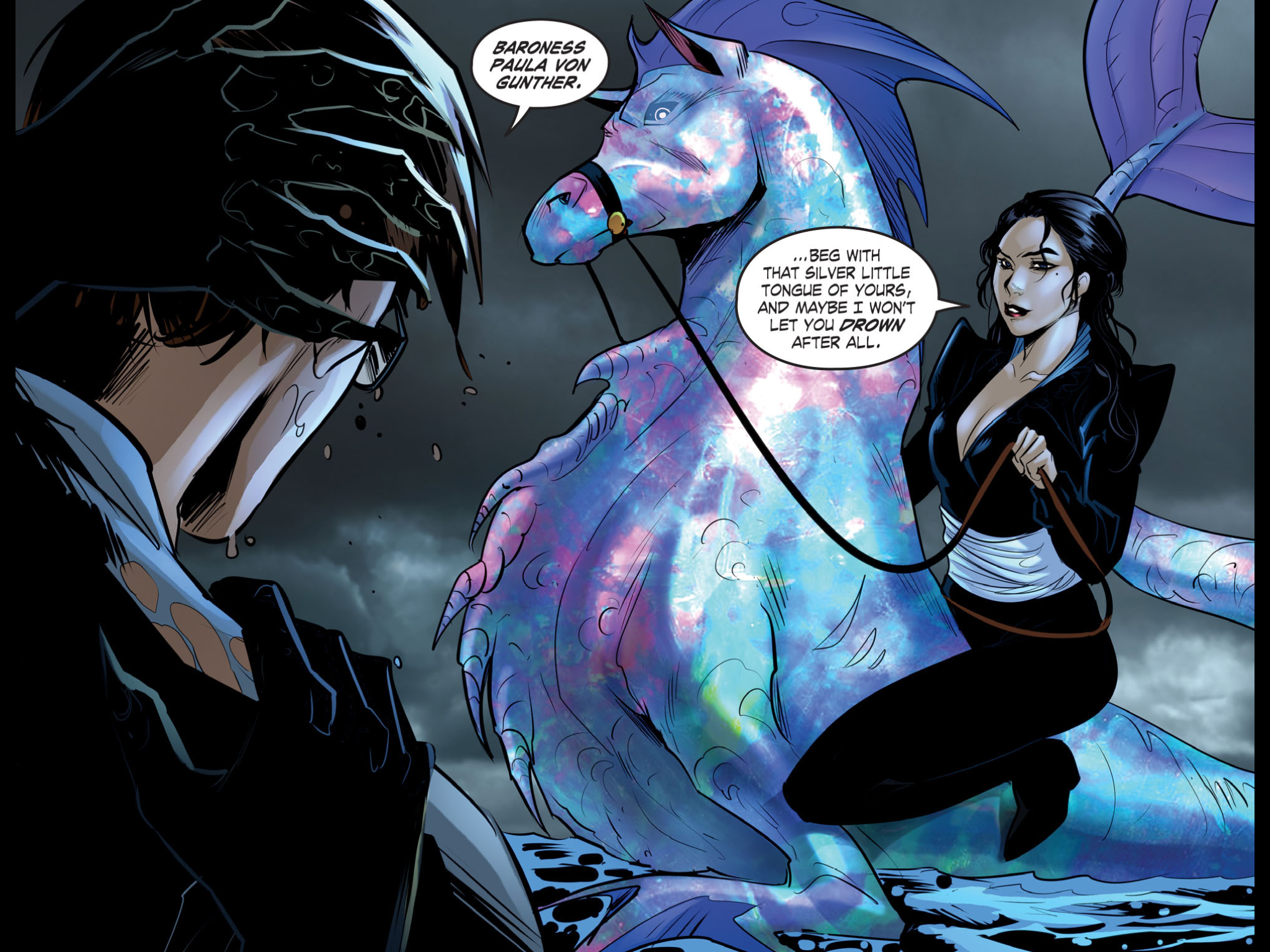 Then up pops Baroness von Gunther with a new hairstyle. She’s also traded in her flying death horse for a rainbow death seahorse.