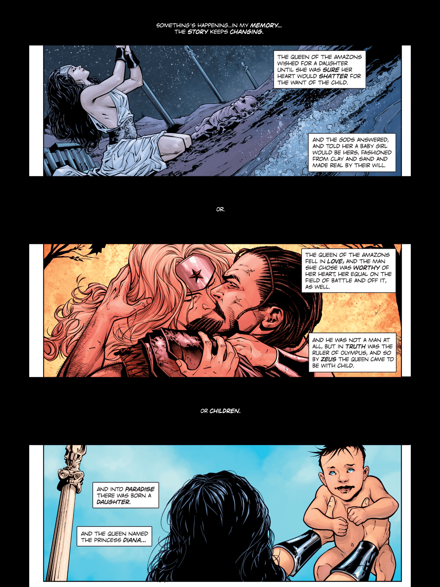 Essentially, rather than a straight out reboot, Rucka takes both pre- and post-Flashpoint continuities and says they’re both true. Or both lies. Daughter of Zeus? Yep. Made out of clay? Yep. Or maybe something else completely different, with Diana remembering both. She also remembers the arrival of a young Steve Trevor on Paradise Island as per the nu52 (although he’s described as a sailor, rather than an airman, but presumably that’s metaphorical), while simultaneously recalling the initial events of George Perez’s Volume 2 with the old-school Ares: