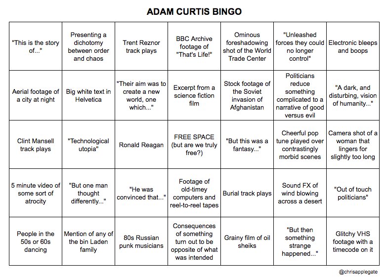 However, before you watch it (assuming you haven’t already), allow me to present Chris Applegate’s Adam Curtis bingo card. For it must be admitted that Curtis has a somewhat distinctive style…
