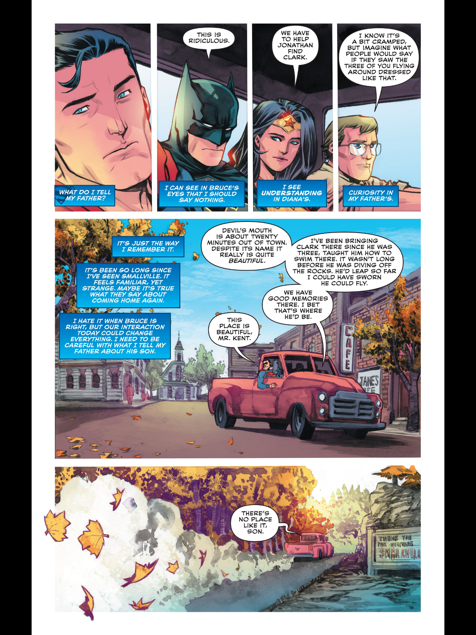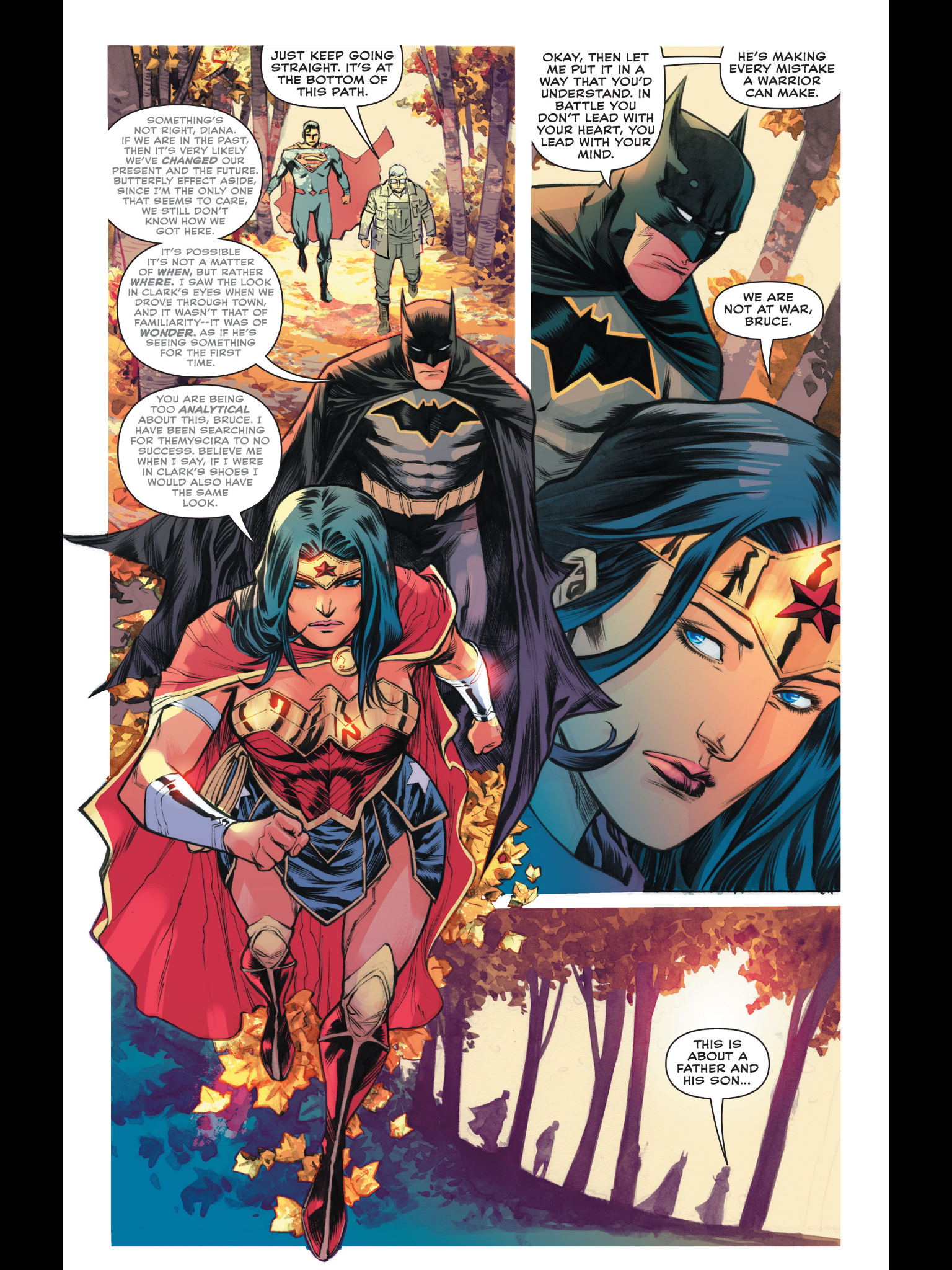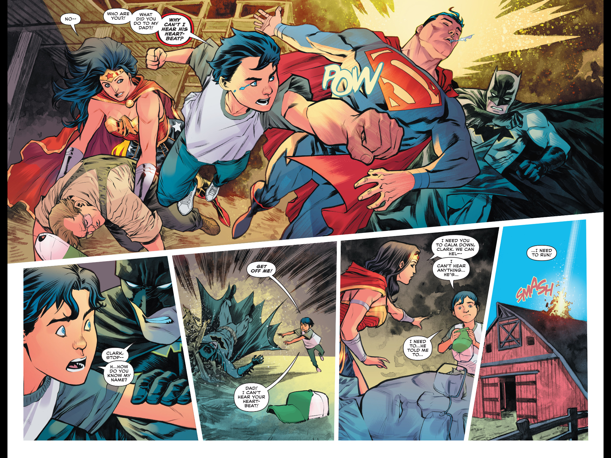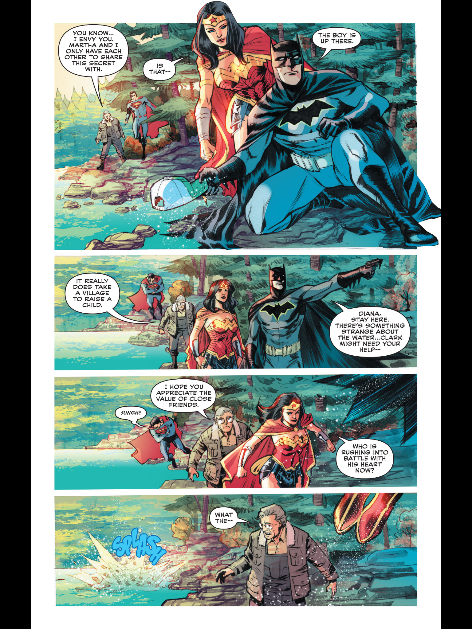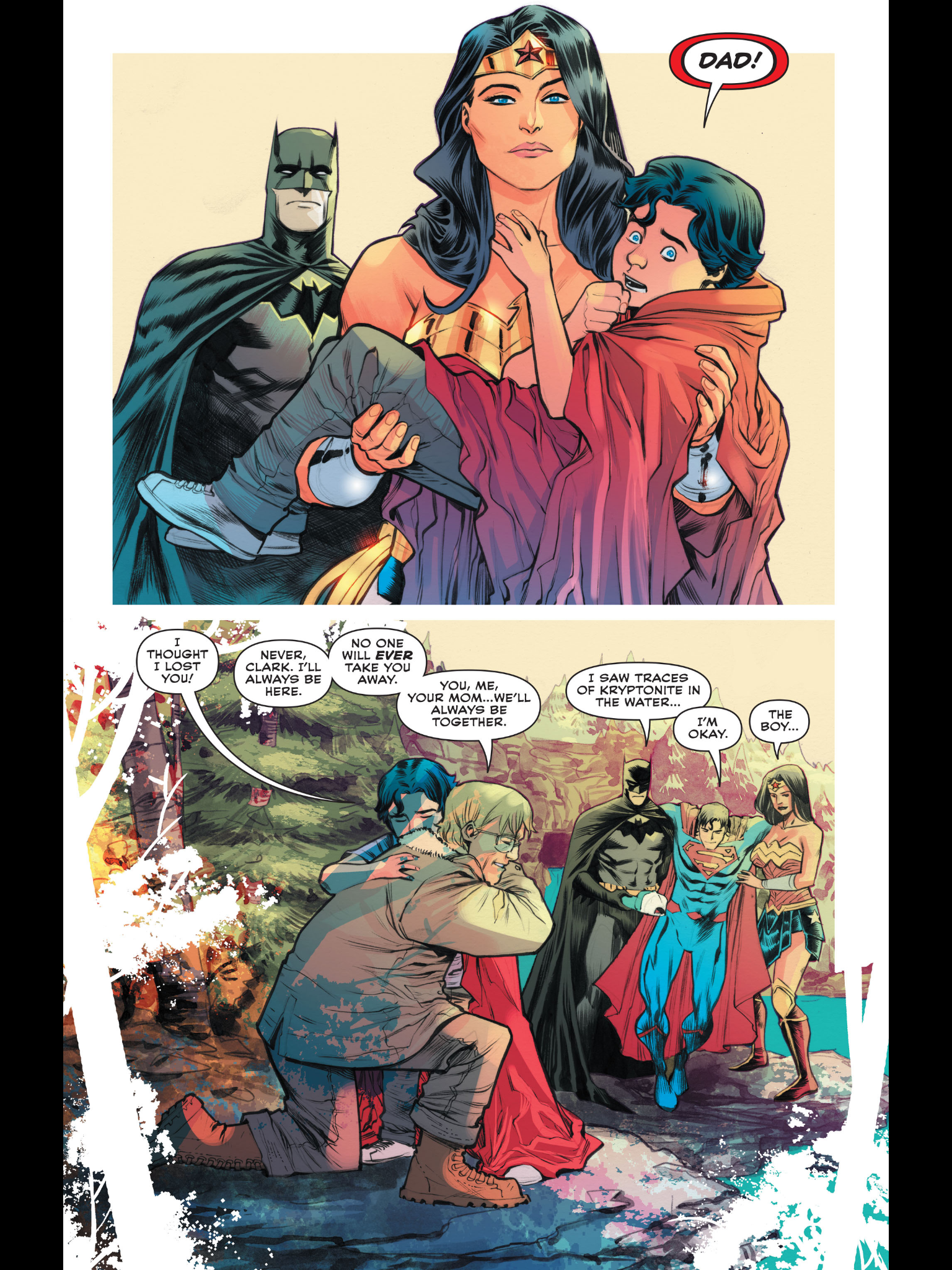 Jonathan Kent and a young Clark Kent turn up, JK appears to have a heart attack, CK runs off, JK gets better and the Trinity have to go off to find young CK, all while not revealing who they are to JK since they suspect that might ruin the timeline. They find CK but then it’s turns out it’s all a dream!