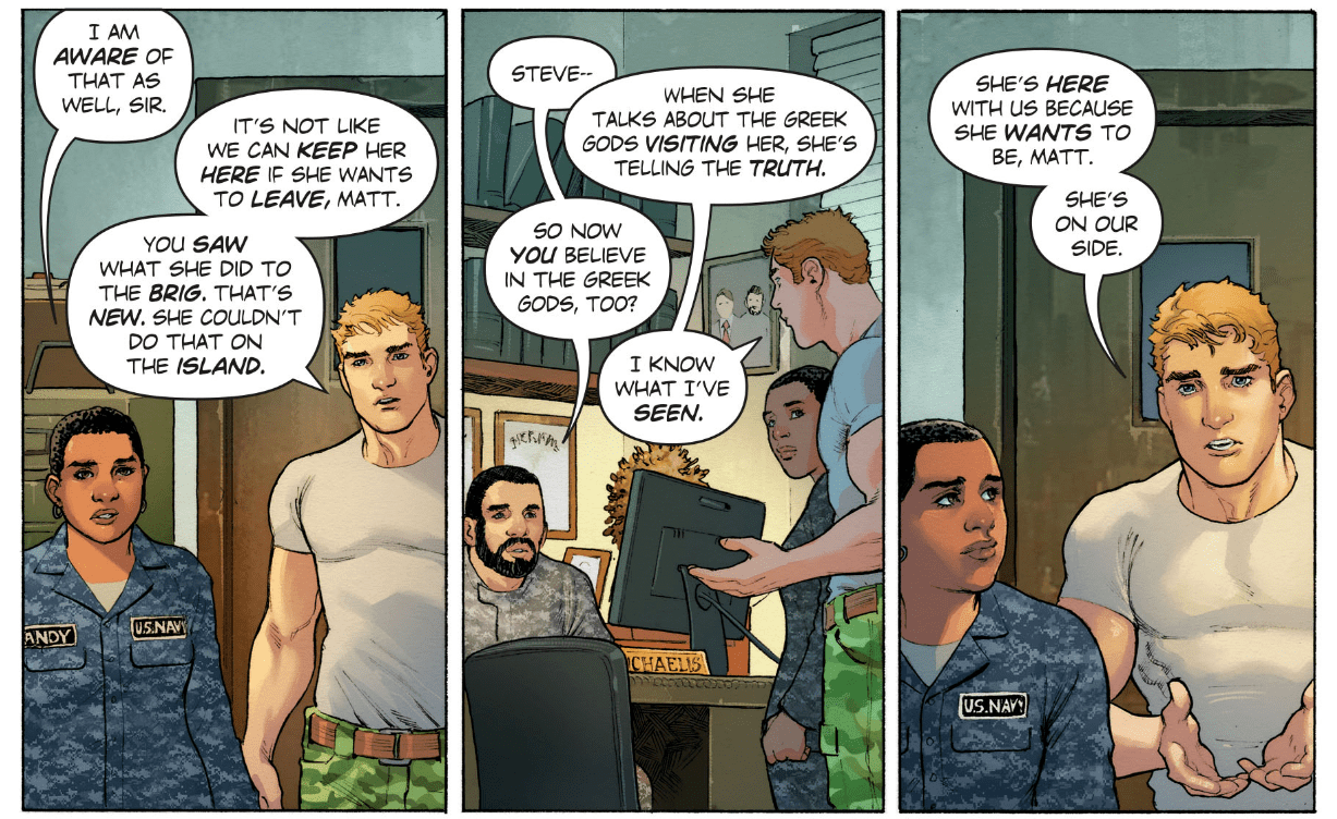 Rucka’s showing that he’s got some good ideas about how to combine all preceding origin stories as well as improve on them – the naval touch makes sense and works better for the current US military configuration. Giving Diana the blessings of pretty much all the gods but only after the Contest, as well as making her precise powers something for her to discover for herself, opens up, rather than closes down the narrative.