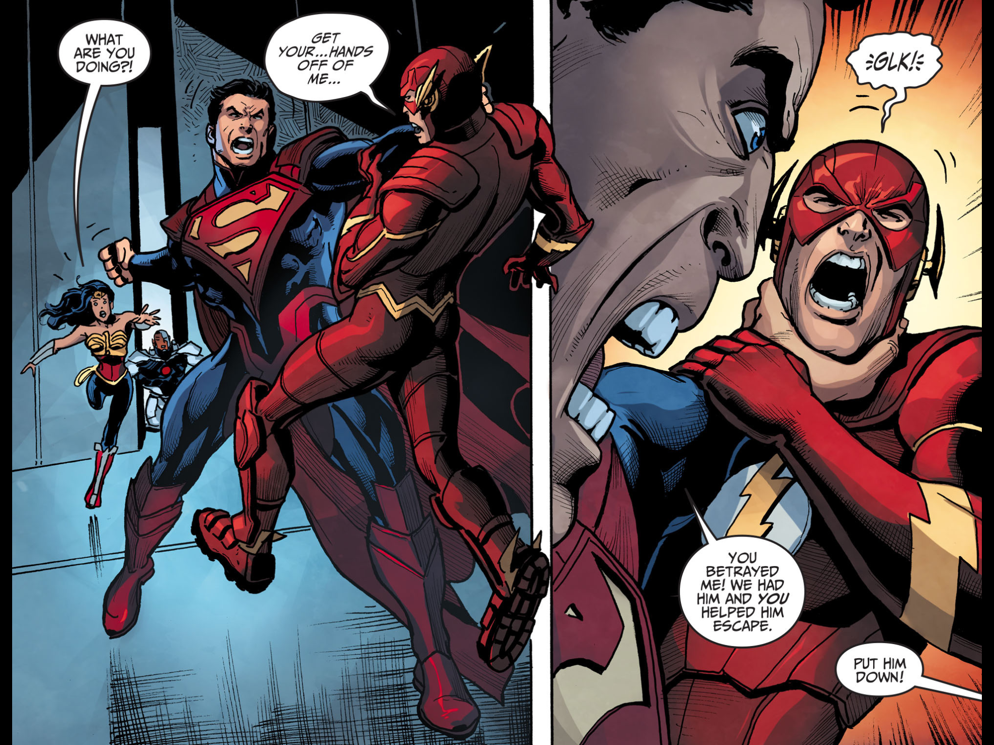 Meanwhile, alternative Diana and alternative, slightly power-mad Superman aren’t getting along very well over in the Injustice: Gods Amongst Us: Year Five #27. But at least they’re getting on better than he and Flash are getting on.