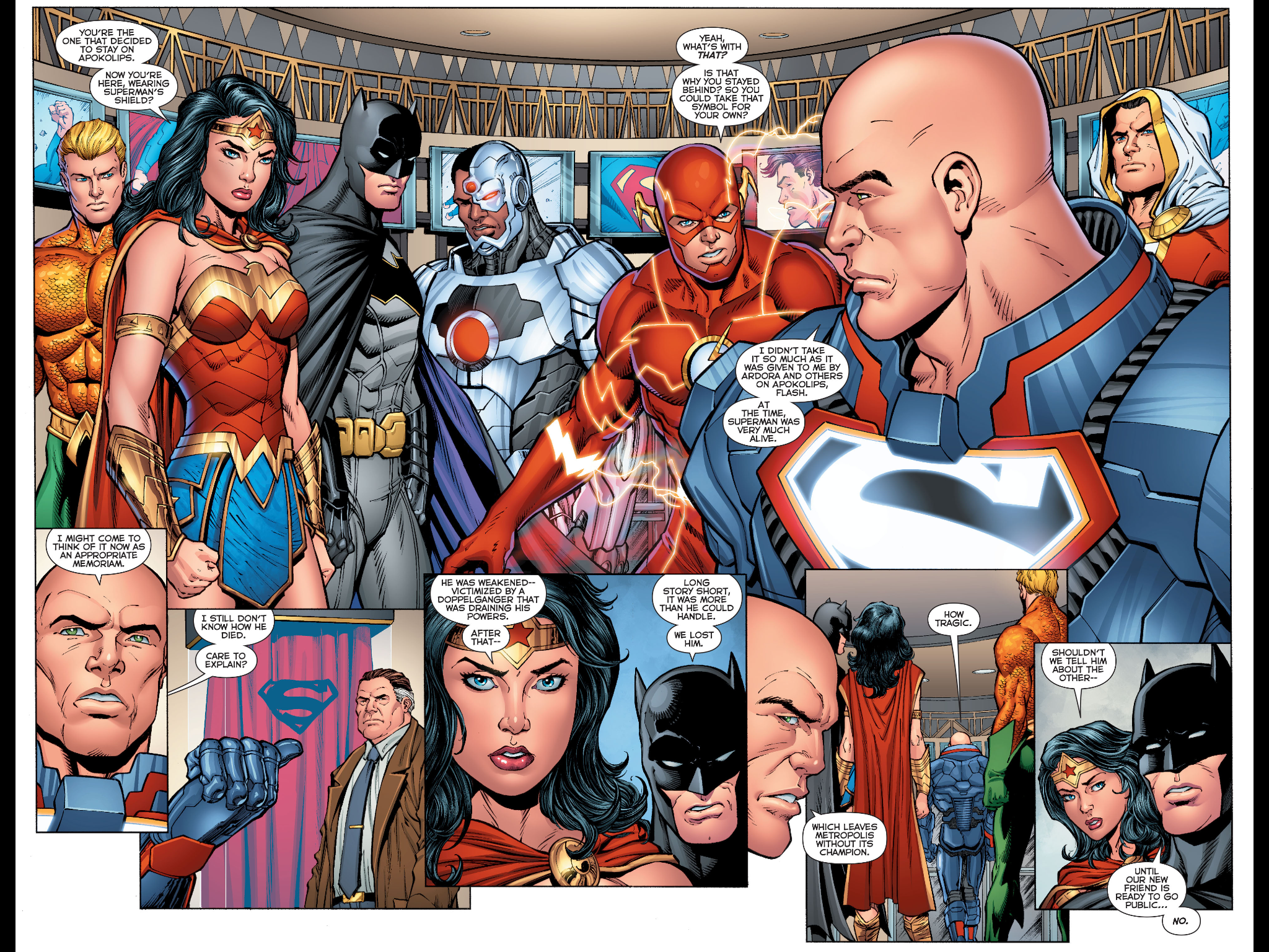 After the jump, I’ll be looking at Diana’s main appearances in comics over the past few weeks: Wonder Woman (Rebirth) #1 and Justice League: Rebirth #1. But I’d be remiss if I didn’t point out before then that Justice League #52 saw Diana a bit miffed (but no more than that) that Lex Luthor not only is wearing Superman’s symbol, he’s also bought the Daily Planet purely so he can own nu52 Superman’s cape.